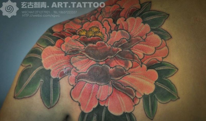 遮盖牡丹纹身图片_肩部背部传统写实国画贴纸植物静物原创成品纹身图案
