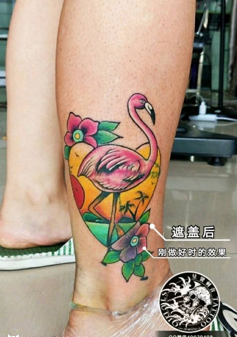 火烈鸟纹身图片_腿部肩部Old SchoolNew School重彩遮盖纹身图案
