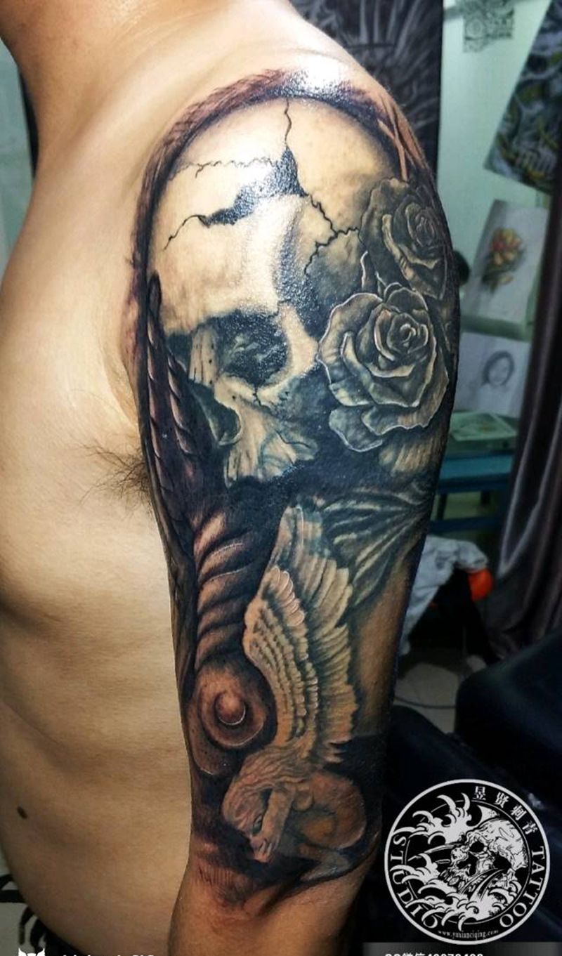 骷髅填实纹身图片_手臂腿部欧美写实新传统遮盖无手稿原创纹身图案