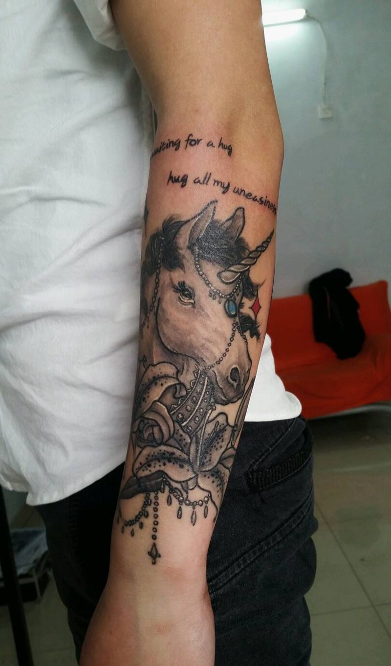 当前位置: 首页 >河南省新乡市纹身店-昱贤刺青纹身图案>独角兽 恢复后纹身图片_手臂欧美清新动物鬼神独角兽成品纹身图案