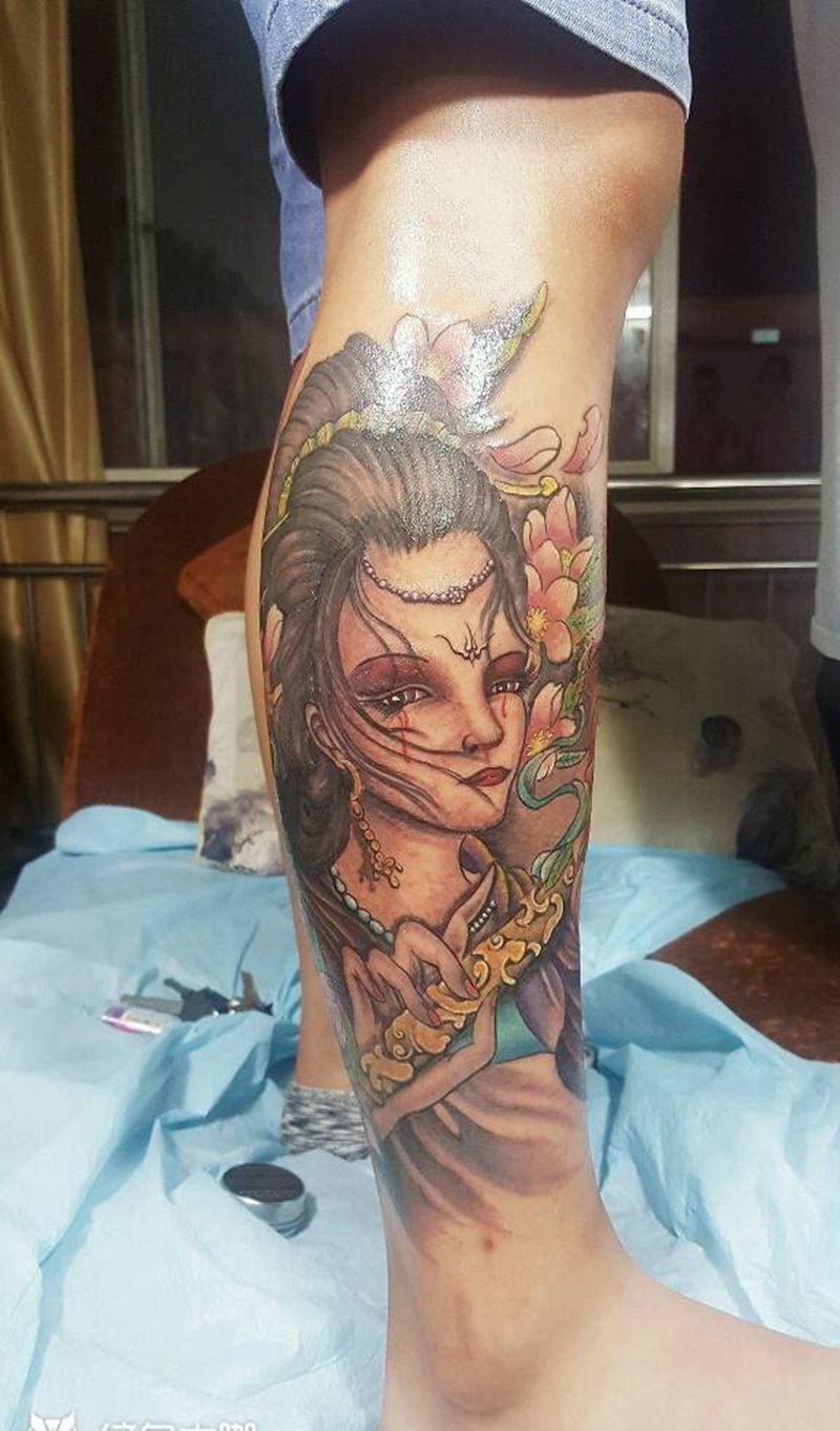 艺姬纹身图片_腿部传统人物成品纹身图案