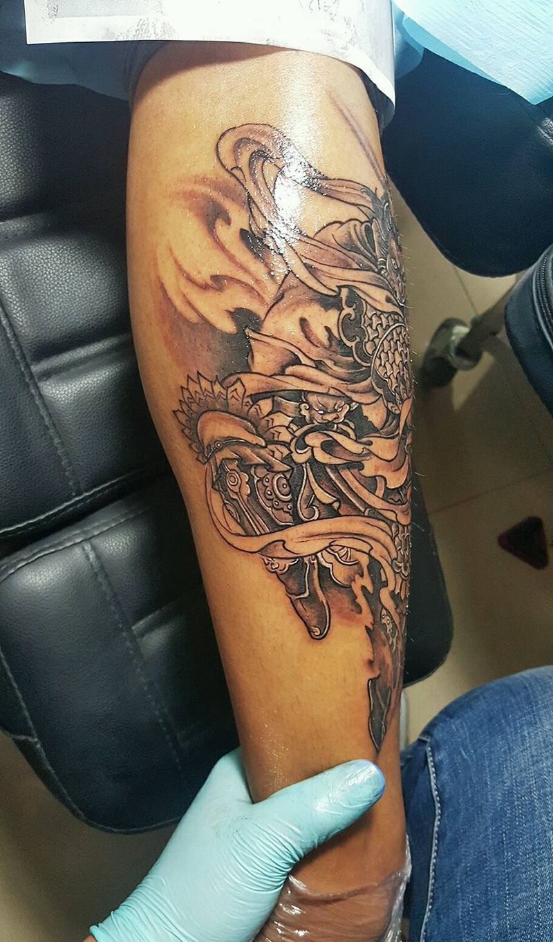 • T网红王老大花腿龙纹身图片_腿部新传统纹身图案
