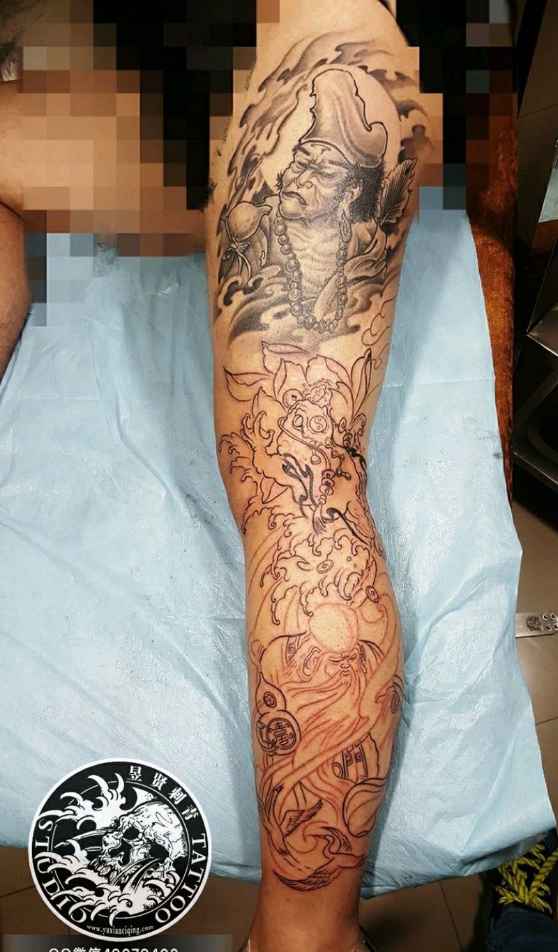 • T网红王老大花腿龙纹身图片_腿部新传统纹身图案
