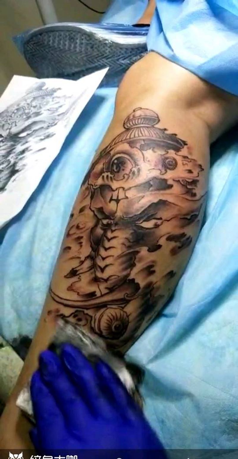 • T网红王老大花腿龙纹身图片_腿部新传统纹身图案