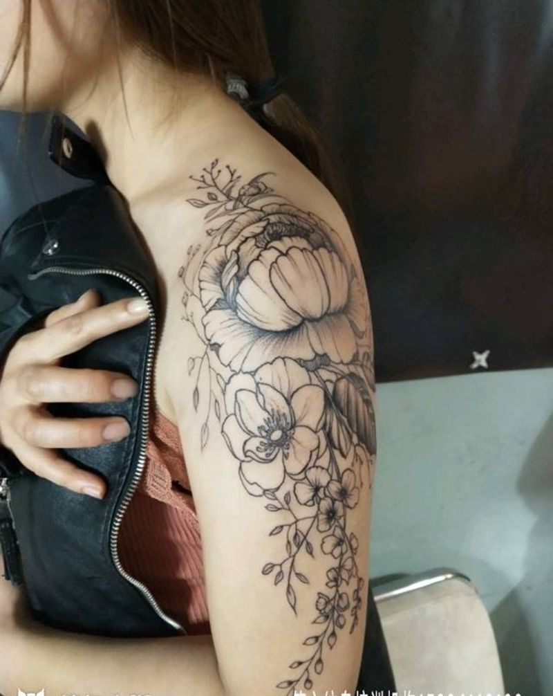 素花原创纹身图片_肩部点刺水墨纹身图案