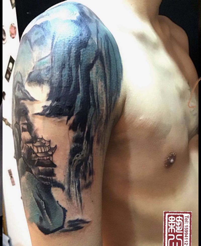 遮盖前女友纹身图片_肩部手臂水墨纹身图案