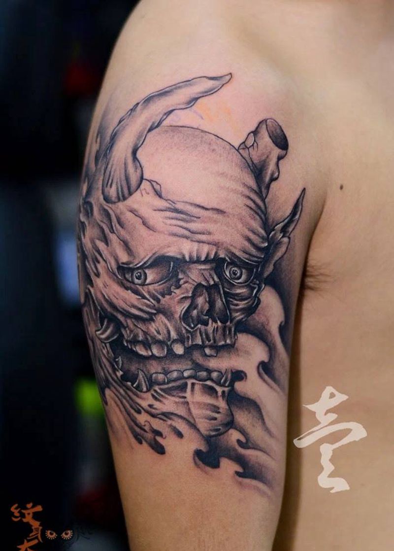 般若vs骷髅,不知道是什么鬼纹身图片_成品手臂传统纹身图案