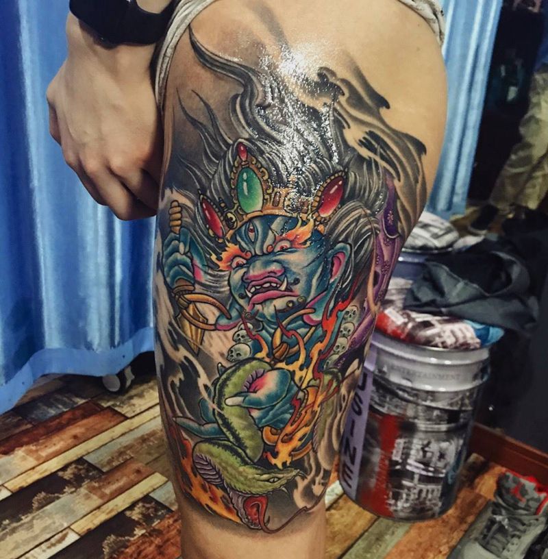 • T网红王老大花腿龙纹身图片_腿部新传统纹身图案