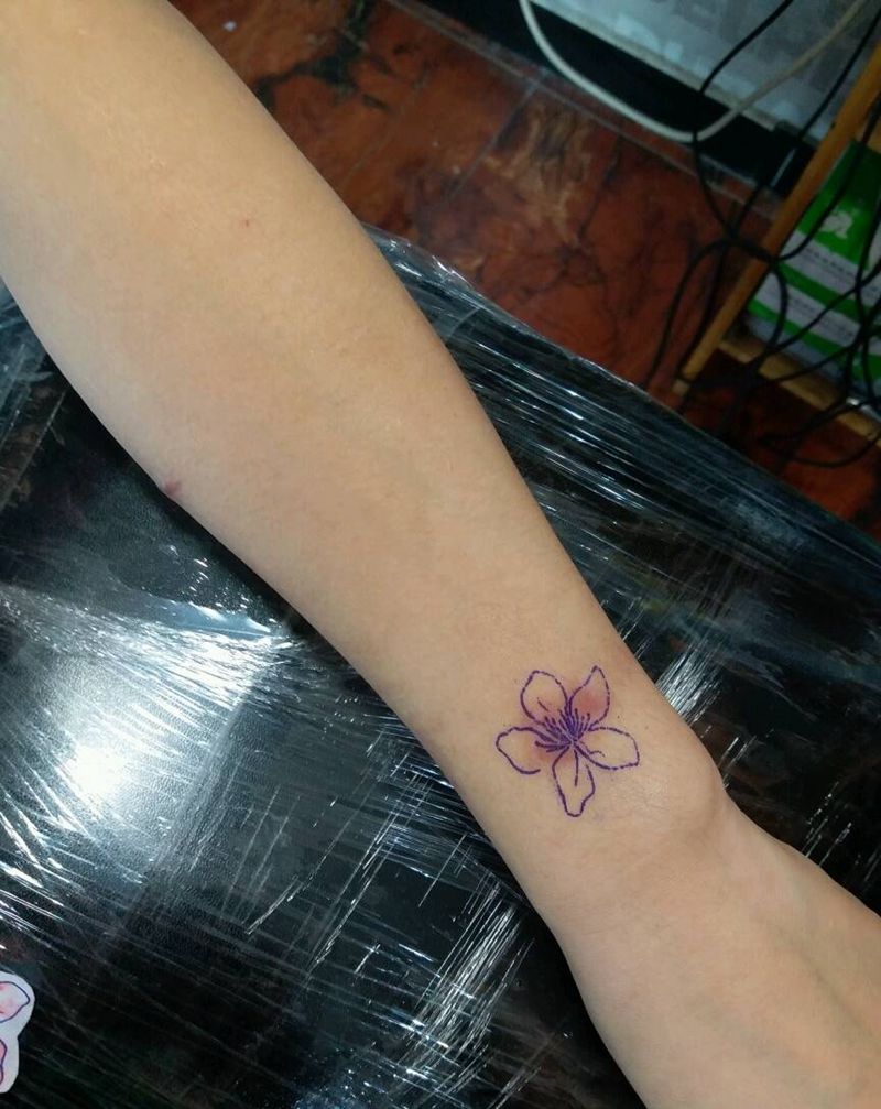 给顾客设计,遮盖疤痕的小花完成纹身图片