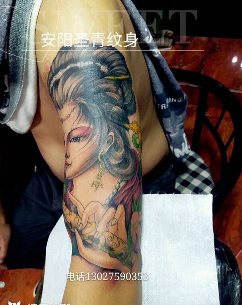 当前位置: 首页 >河南省安阳市纹身店-安阳圣青纹身工作室纹身图案>彩色艺姬遮盖失败纹身完成纹身图片