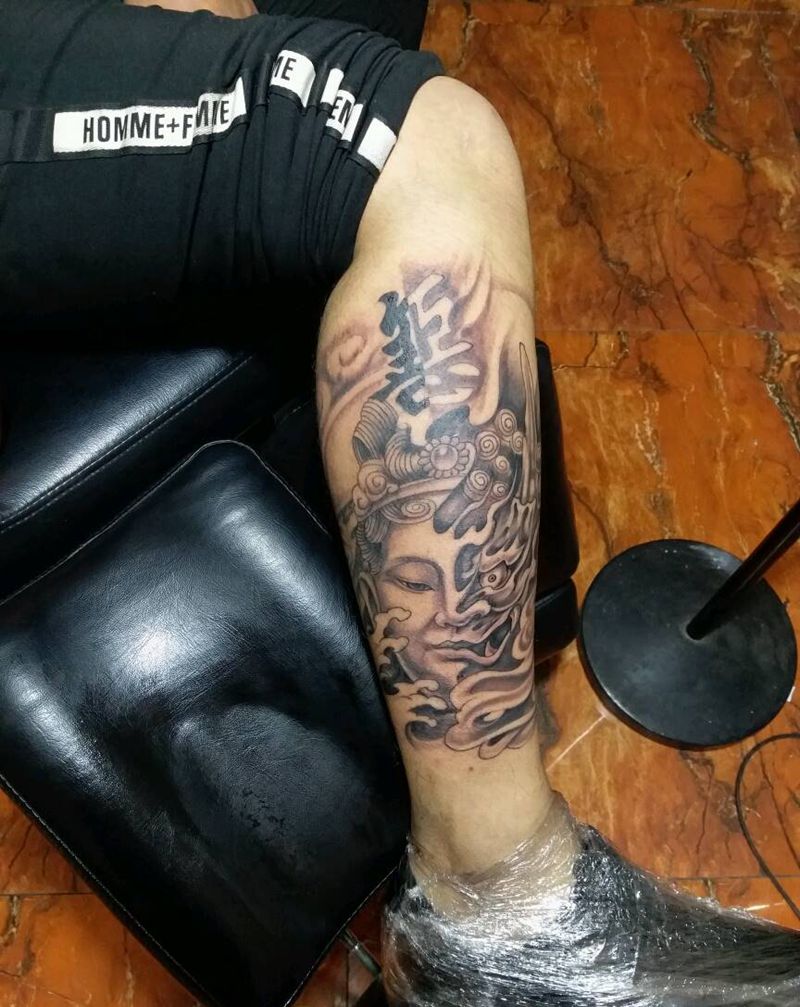 当前位置: 首页 >河南省安阳市纹身店-安阳圣青纹身工作室纹身图案>小腿善恶完成纹身图片
