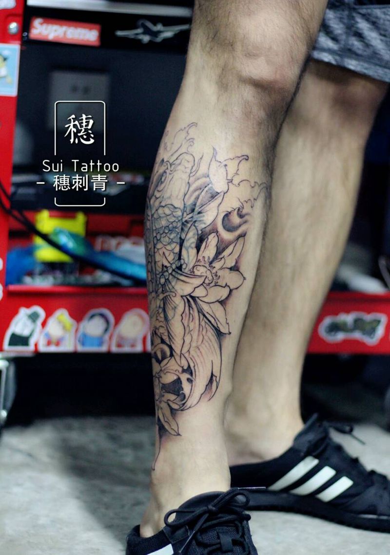 • T网红王老大花腿龙纹身图片_腿部新传统纹身图案