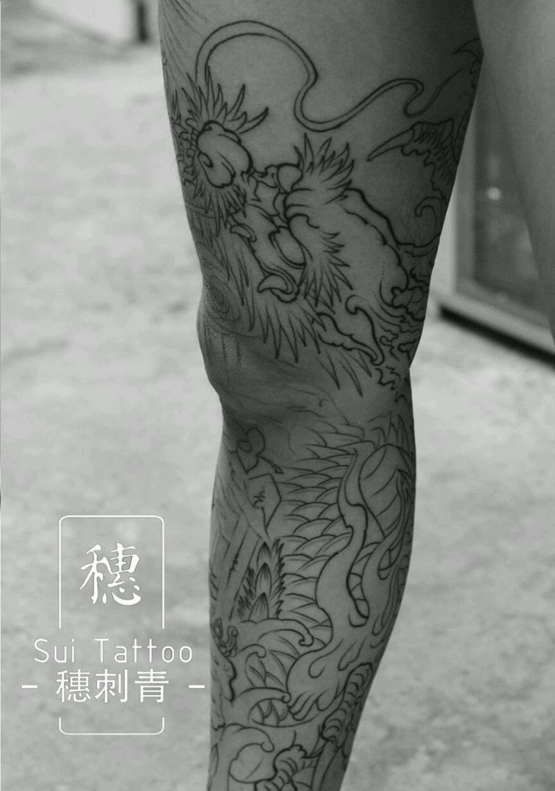 • T网红王老大花腿龙纹身图片_腿部新传统纹身图案