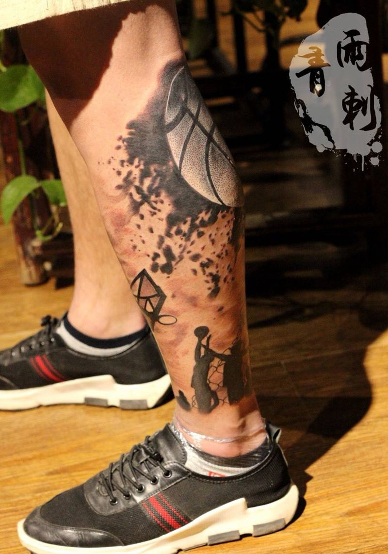 写实篮球纹身图片_成品腿部写实原创纹身图案