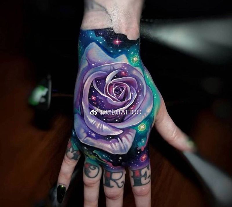• 手背潮流时尚的玫瑰花眼睛纹身图案