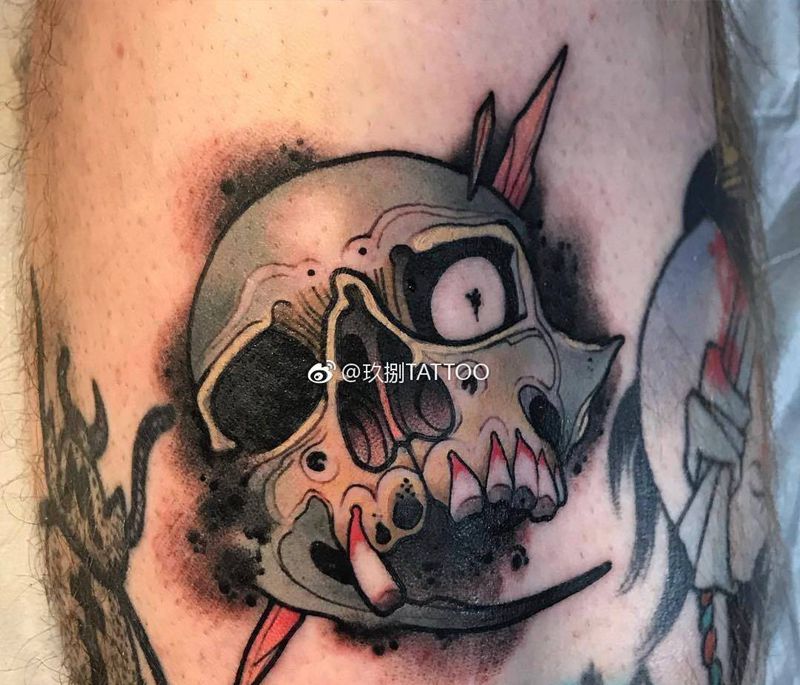 • T包小腿吹火男+阿多福纹身图片_腿部老传统新传统吹火男阿