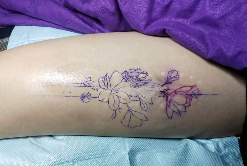 彩色疤痕遮盖纹身图片_腿部水彩纹身图案