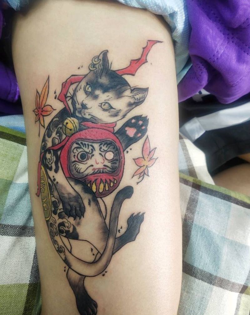 日式招财猫纹身图片_腿部老传统水彩纹身图案