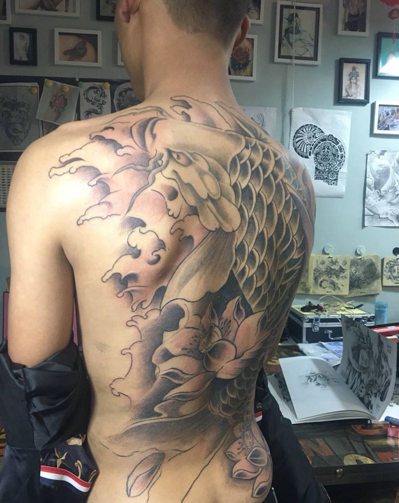 当前位置: 首页 >河南省安阳市纹身店-上海刺客纹身纹身图案>满背锦鲤纹身图片