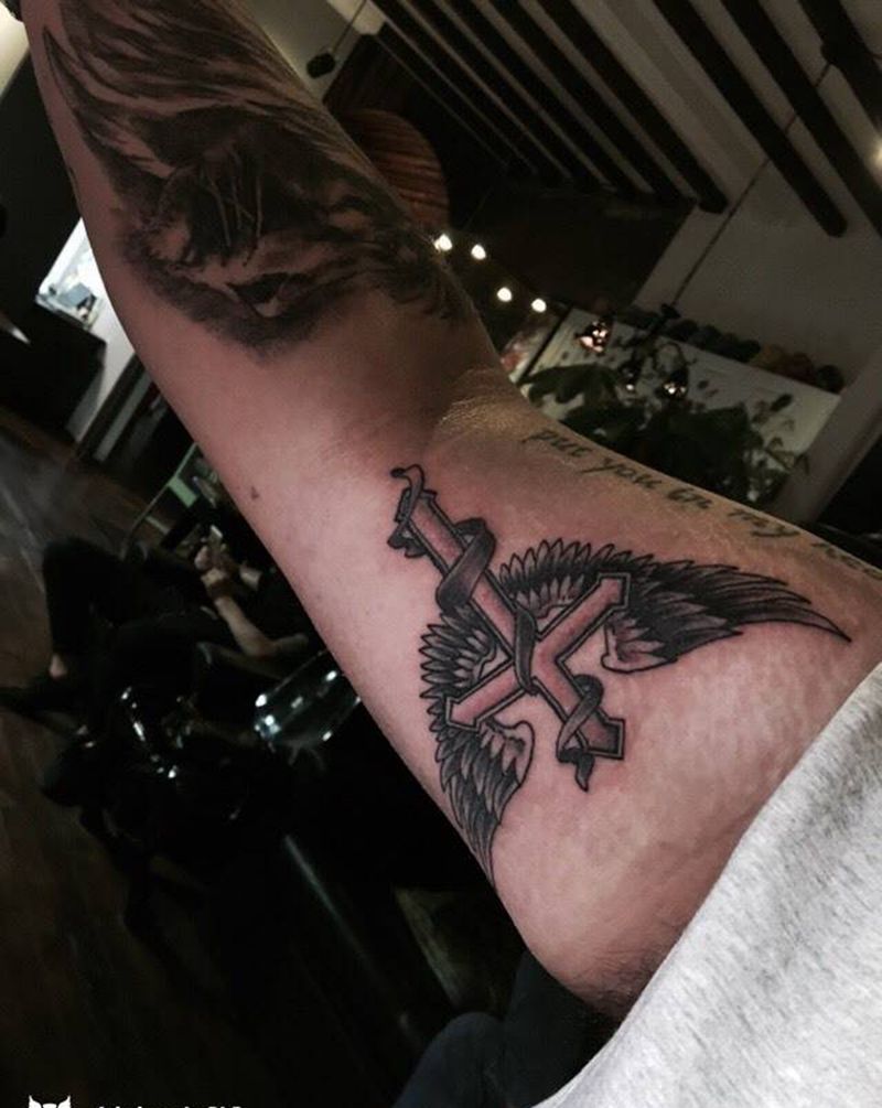 当前位置: 首页 >河南省安阳市纹身店-上海刺客纹身纹身图案>十字架翅膀飘带纹身图片_成品手臂欧美宗教纹身图案