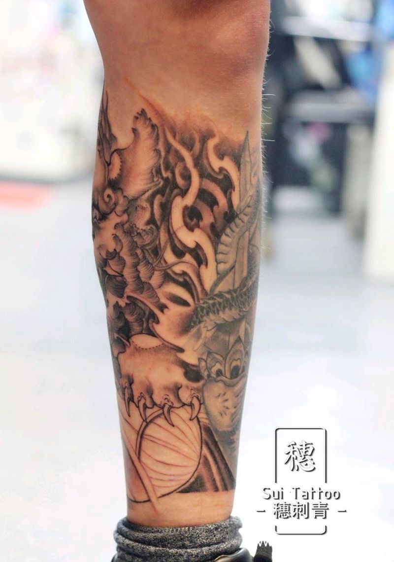 • T网红王老大花腿龙纹身图片_腿部新传统纹身图案