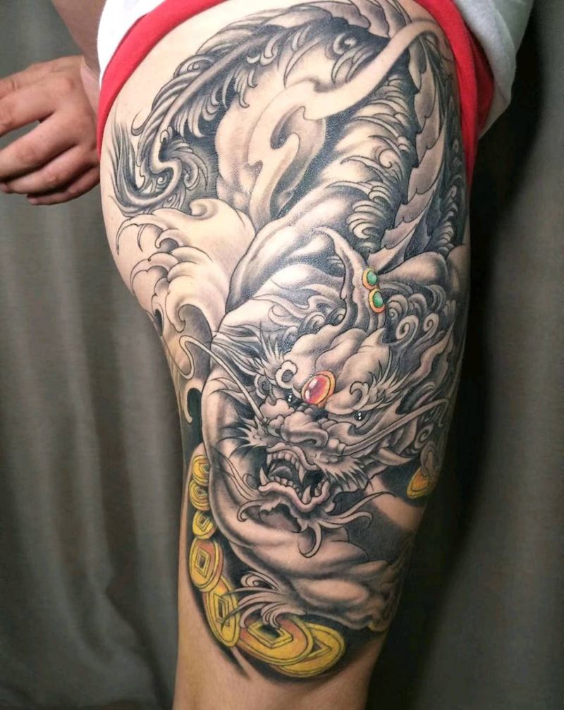 • T网红王老大花腿龙纹身图片_腿部新传统纹身图案