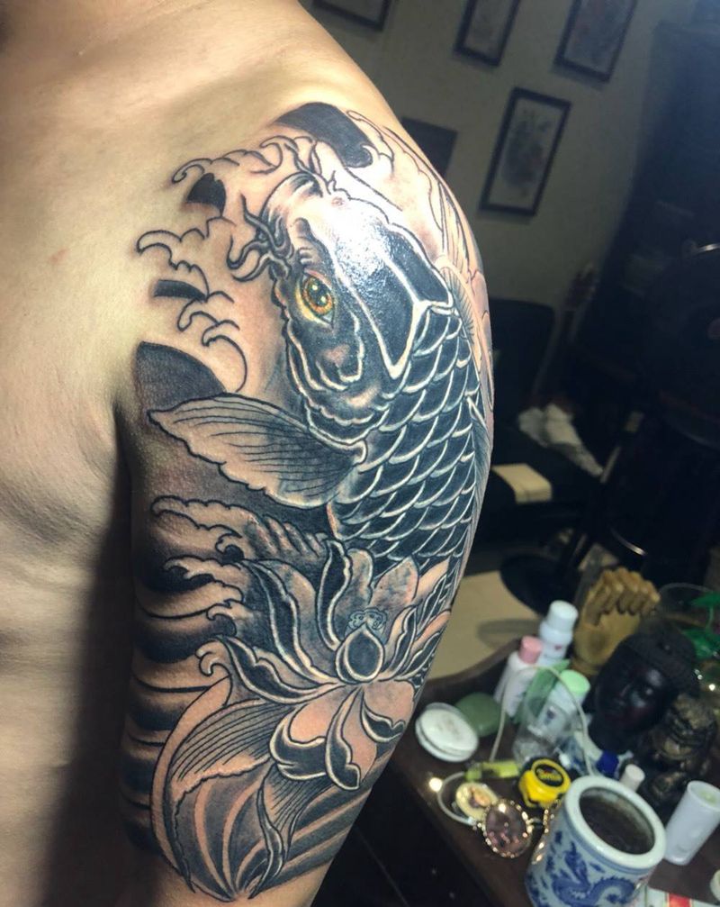 当前位置: 首页 >河南省焦作市纹身店-蝈蝈刺青纹身图案>大臂鲤鱼遮盖旧图纹身图片
