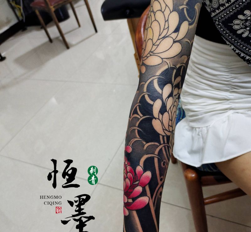 当前位置: 首页 >河南省许昌市纹身店-恒墨·刺青纹身图案>老传统菊花花臂纹身图片_手臂老传统纹身图案