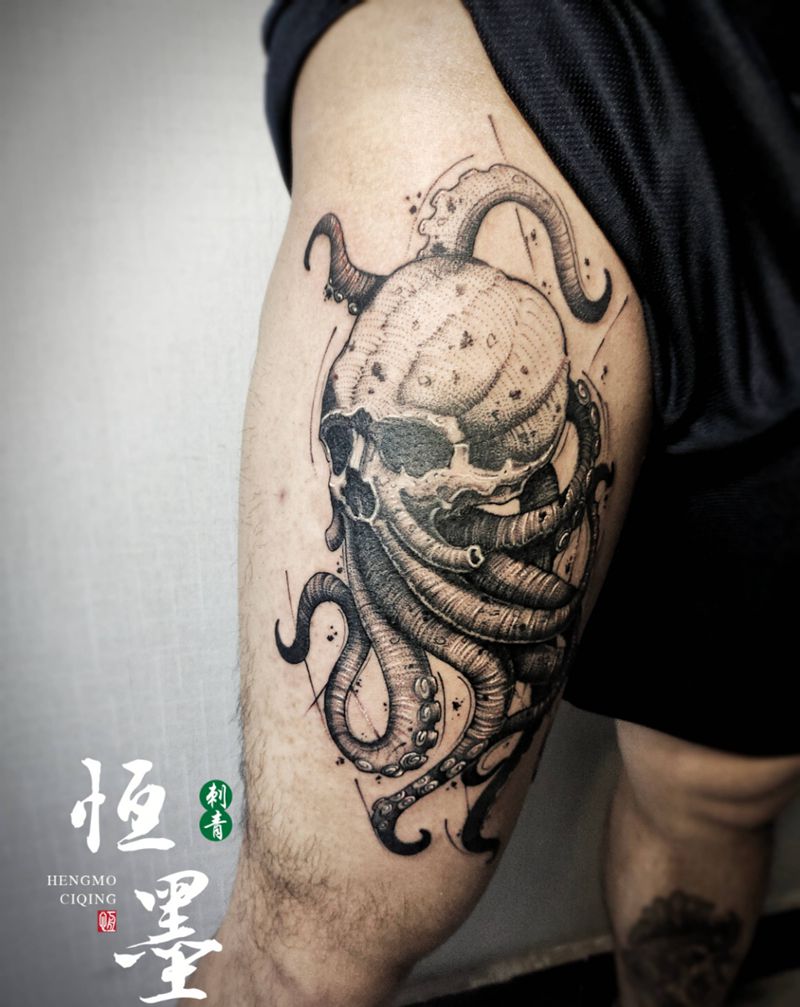 当前位置: 首页 >河南省许昌市纹身店-恒墨·刺青纹身图案>骷髅章鱼纹身图片_腿部点刺暗黑纹身图案