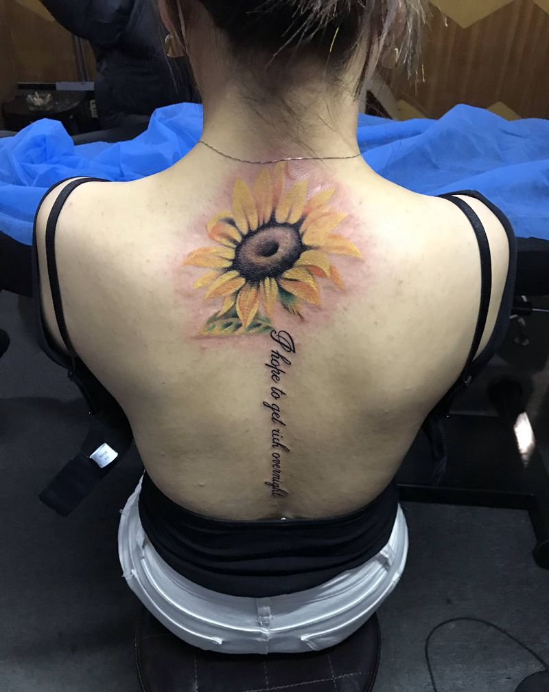 当前位置: 首页 >河南省许昌市纹身店-禹州秋墨坊纹身纹绣培训机构纹身图案>向日葵纹身图片_背部欧美写实花体字纹身图案