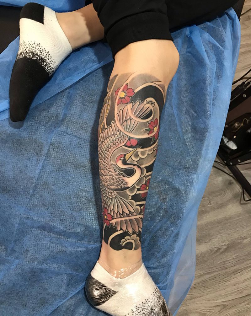 当前位置: 首页 >河南省许昌市纹身店-禹州秋墨坊纹身纹绣培训机构纹身图案>鹤纹身图片_腿部老传统新传统纹身图案