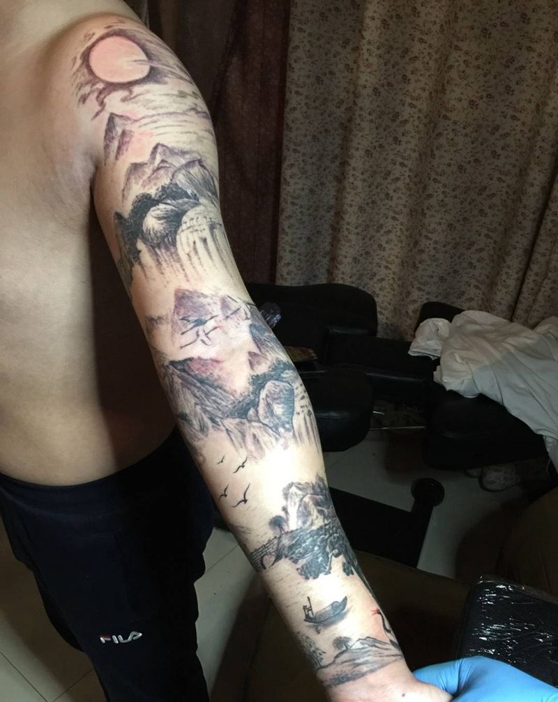 当前位置: 首页 >河南省许昌市纹身店-禹州秋墨坊纹身纹绣培训机构纹身图案>山水花臂纹身图片