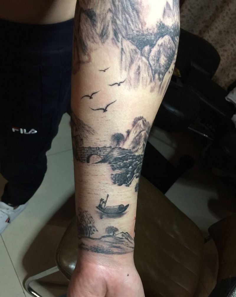 当前位置: 首页 >河南省许昌市纹身店-禹州秋墨坊纹身纹绣培训机构纹身图案>山水花臂纹身图片