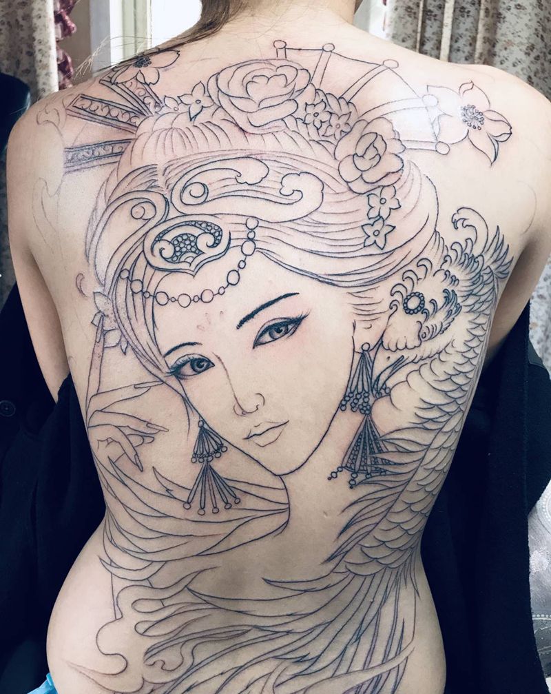 艺妓满背未完待纹身图片_背部新传统纹身图案