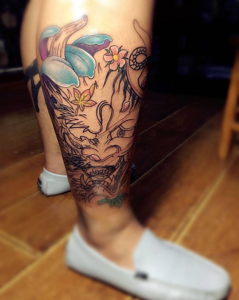 • T网红王老大花腿龙纹身图片_腿部新传统纹身图案