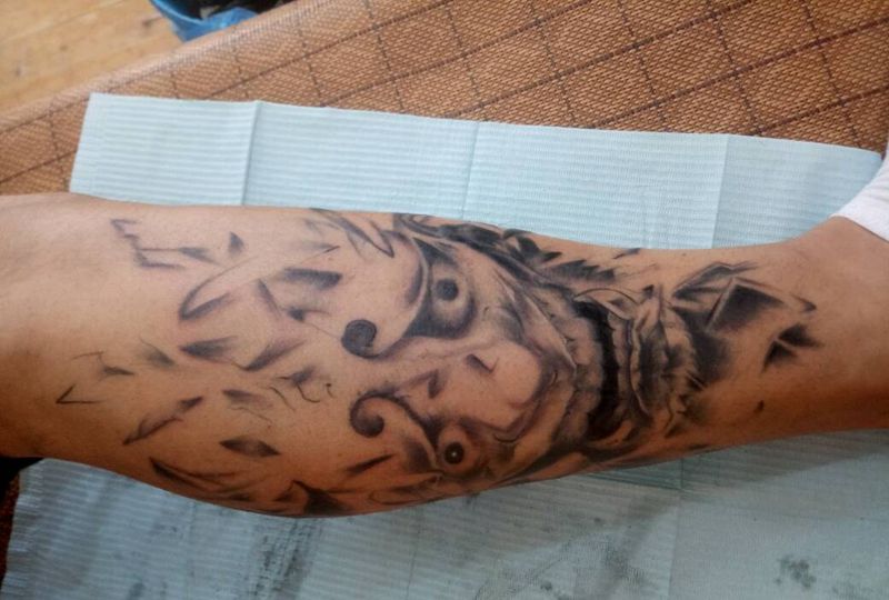• T包小腿吹火男+阿多福纹身图片_腿部老传统新传统吹火男阿