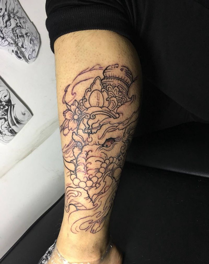 • T网红王老大花腿龙纹身图片_腿部新传统纹身图案