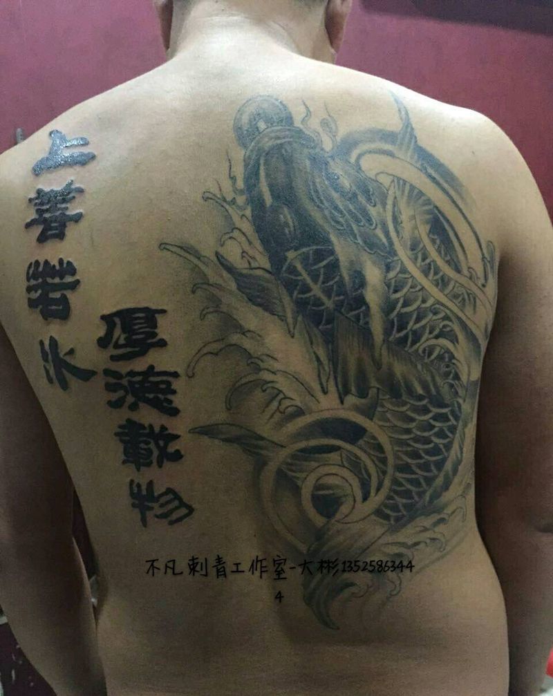 当前位置: 首页 >河南省三门峡市纹身店-客都购物广场纹身图案>半背鲤鱼,添加水墨字纹身图片
