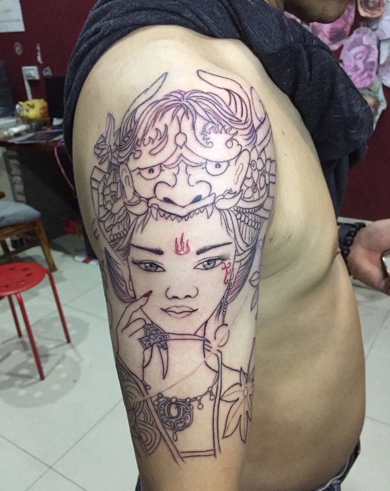 当前位置: 首页 >河南省三门峡市纹身店-客都购物广场纹身图案>佛➕艺妓纹身图片_手臂腿部成品传统习俗宗教人物纹身图案