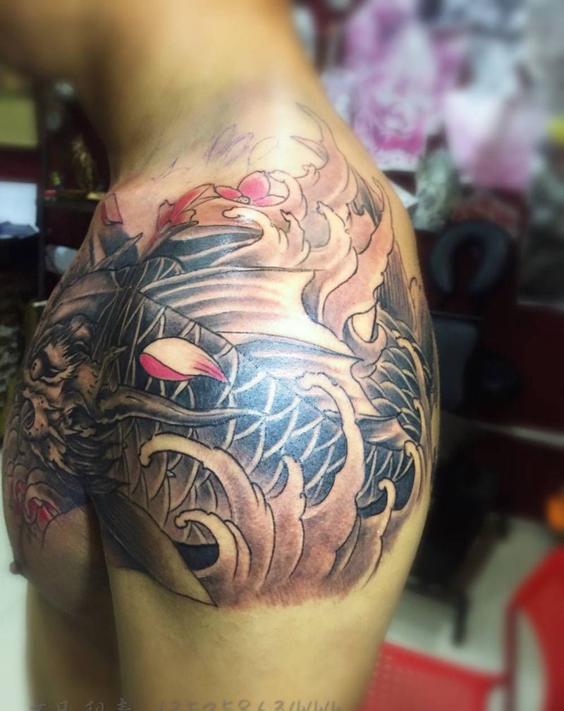 熬鱼,鲤鱼化龙纹身图片_手臂背部肩部成品传统动物鲤鱼纹身图案