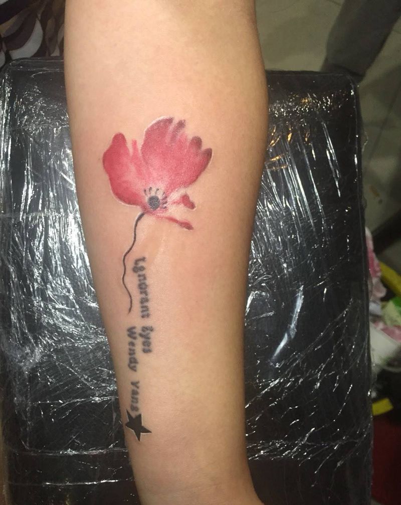 罂粟花,字母是所谓的半永久纹身纹身图片_成品手臂清新植物纹身图案