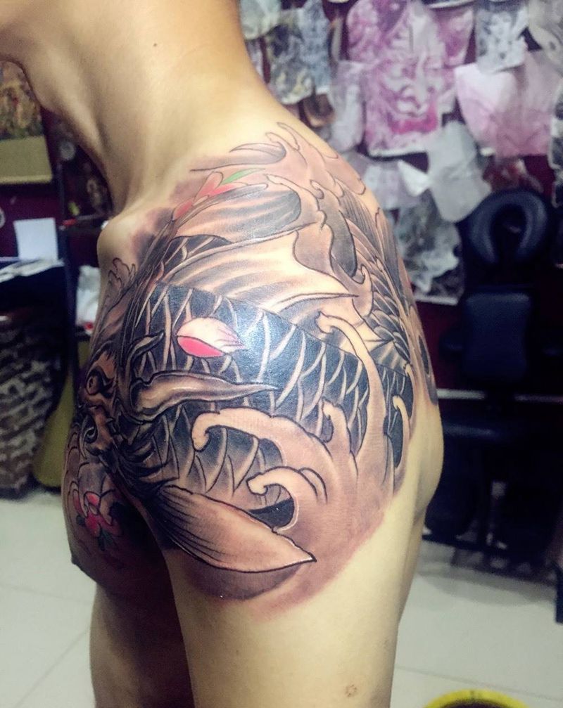 熬鱼纹身图片_成品肩部胸部传统动物纹身图案