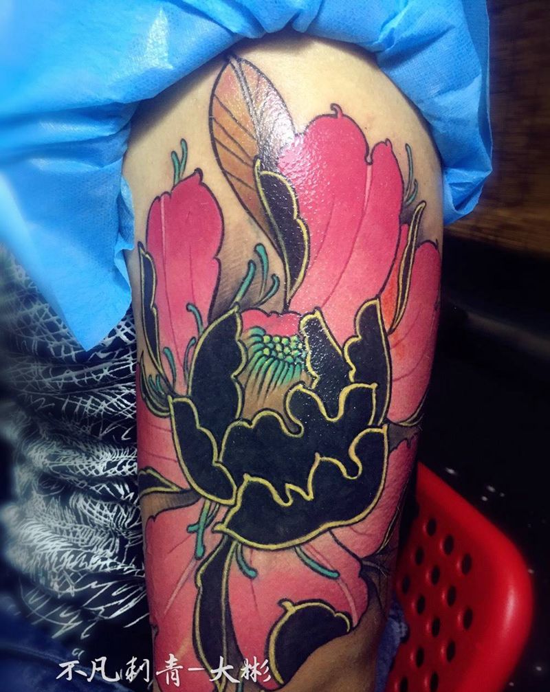 牡丹花遮盖纹身图片_成品手臂肩部传统原创遮盖植物纹身图案