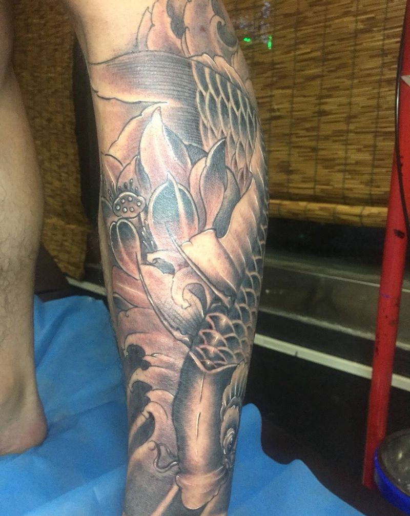 当前位置: 首页 >河南省三门峡市纹身店-客都购物广场纹身图案>小腿锦鲤纹身图片_成品腿部传统动物鲤鱼原创纹身图案