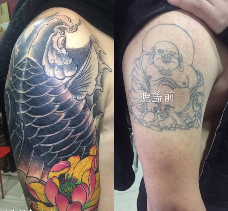 大臂锦鲤遮盖弥勒佛纹身图片_成品手臂传统动物鲤鱼纹身图案