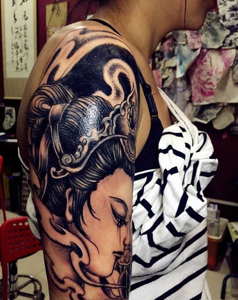 艺妓,遮盖狼头纹身图片_成品肩部手臂传统人物艺姬艺妓纹身图案