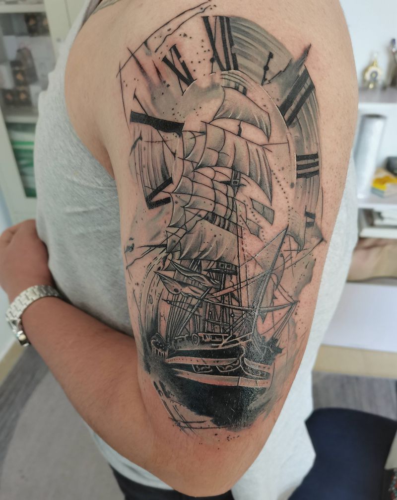 当前位置: 首页 >河南省南阳市纹身店-刺青春专业纹身纹身图案>帆船第二次完工纹身图片_手臂水墨欧美写实纹身图案