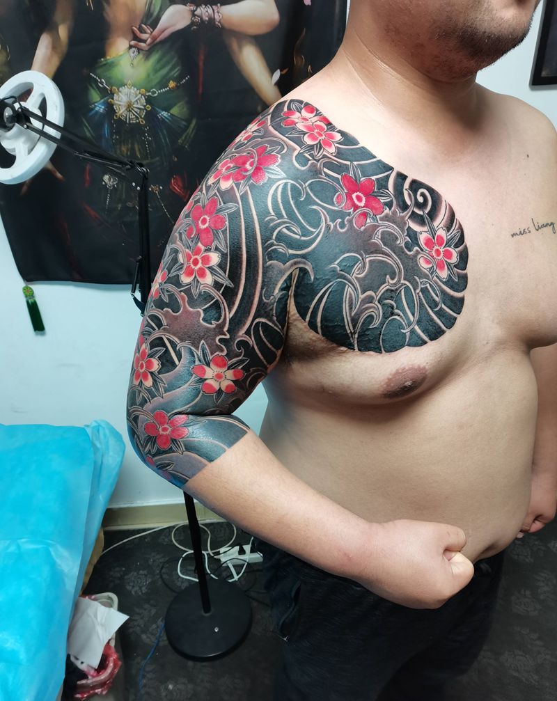 当前位置: 首页 >河南省南阳市纹身店-刺青春专业纹身纹身图案>七分袖半甲纹身图片_手臂胸部老传统纹身图案
