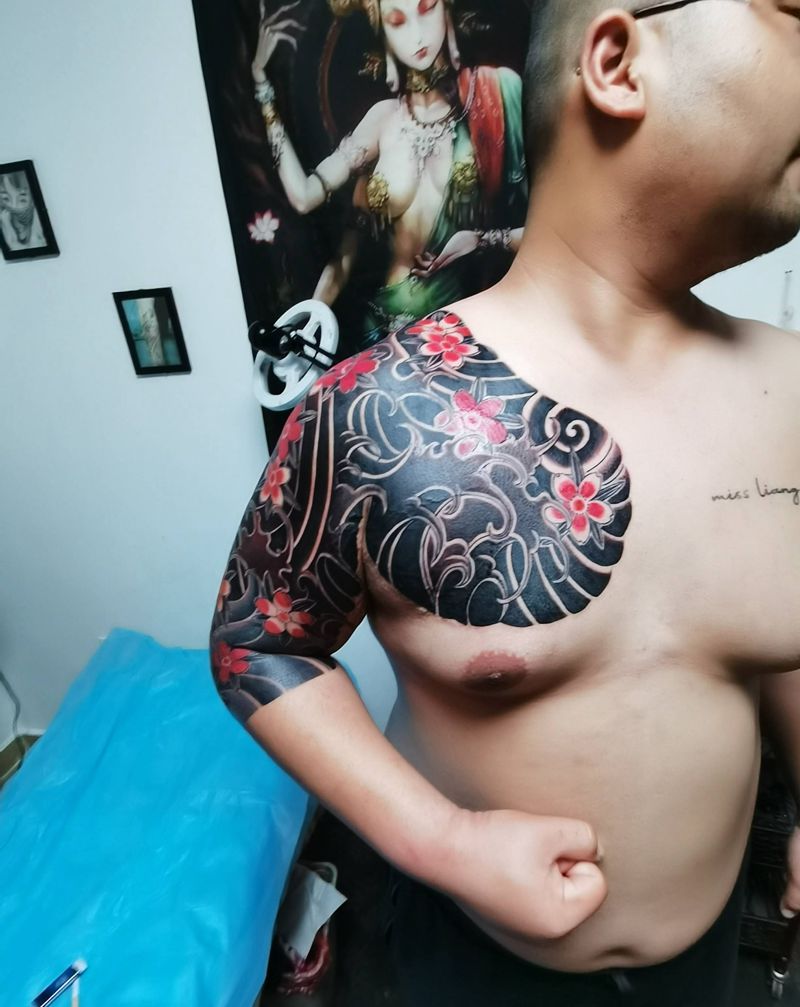 七分袖半甲纹身图片_手臂胸部老传统纹身图案