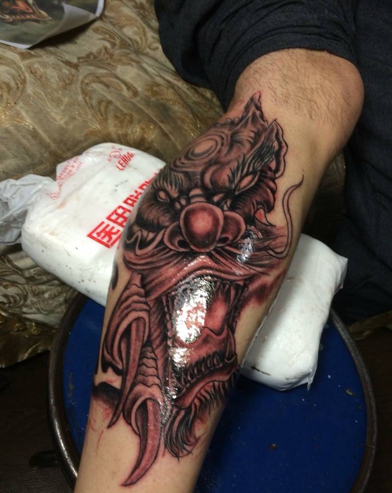• T网红王老大花腿龙纹身图片_腿部新传统纹身图案
